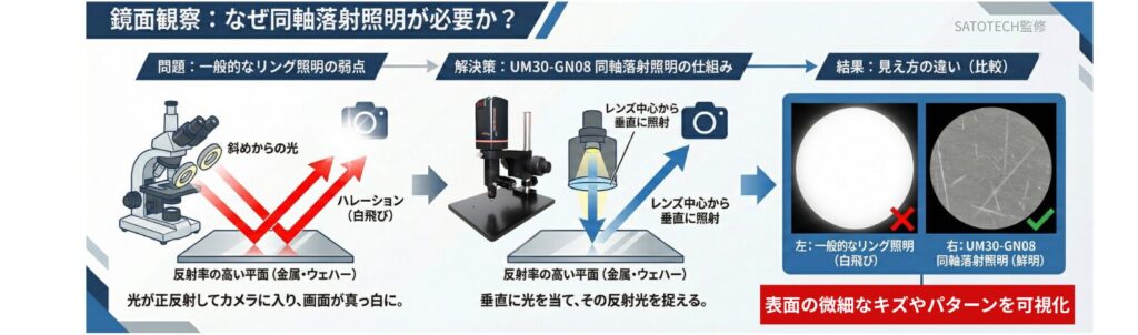 鏡面(金属・ウェハー)の観察において、通常のリング照明では起こる「ハレーション(白飛び)」を物理的に防ぎ、表面の微細なキズやパターンを可視化するためです。