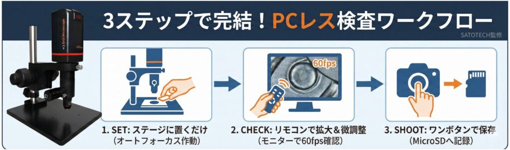 高倍率検査における最大のストレスは「ピント合わせ」です。 UM30-GN08は、以下のフローでストレスフリーな検査を実現します。