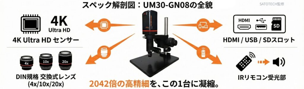 UM30-GN08は、同軸落射照明と4K CMOSセンサーを搭載した、HDMI直結型のデジタル金属顕微鏡です。