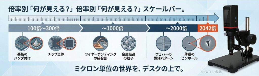 最高2042倍の高倍率で、金属や半導体の微細構造をPCなしで瞬時に検査・撮影できます。
