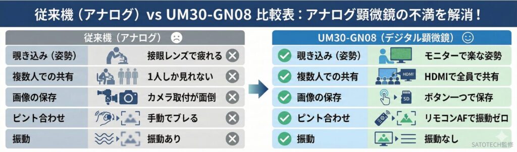 2000倍超の世界では、本体に触れるわずかな振動すら命取りです。 本機は赤外線リモコンですべて(フォーカス、ズーム、撮影、照明)を操作できるため、手ブレによる検査ミスを物理的にゼロにします。