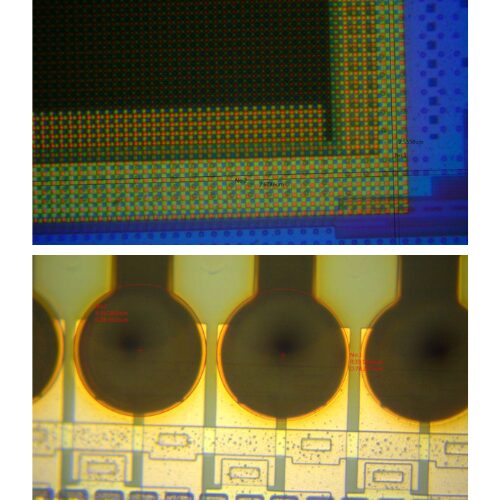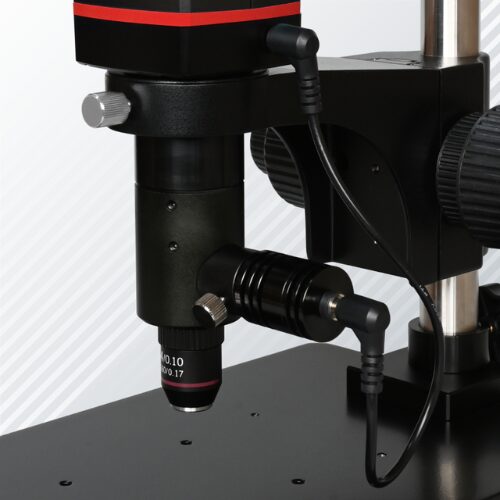 - UM30-GN08の同軸落射照明: レンズの光軸と同じ向きに光を当てます。これにより、ウェハーの配線パターンや金属の研磨面など、フラットで反射率の高いサンプルの観察に最適化されています。
