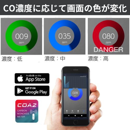 - 警報(音)とCO濃度に応じた警告ランプを装備