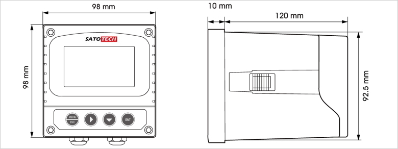本機は盤面に取り付けるパネルマウント型です。正確な穴あけ加工が必要となるため、あらかじめ外形寸法とパネルカット寸法を把握しておく必要があります。