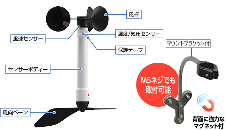風速・風向センサー:マウントブラケットつきで簡単に取り付けできます