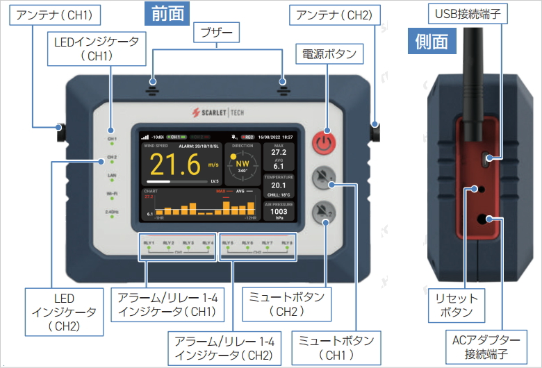 | 標準付属品 | ワイヤレス風速・風向センサー×1、表示ユニット×1、アンテナ (×2)、マグネット式ブラケット、センサー用電池 (リチウム電池×1)、六角レンチ、マグネットシール (丸型×1、四角型×2)、ACアダプター、USBケーブル、キャリングケース |