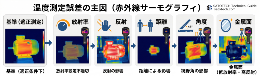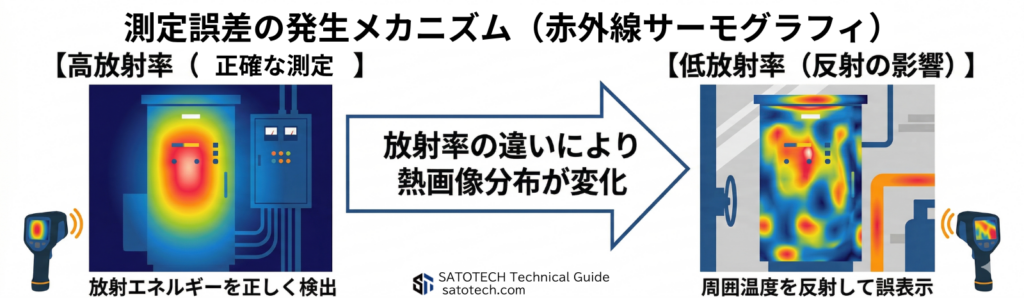 その理由は、測定結果が放射率・反射・距離・観察条件・対象サイズなどの影響を受けるためです。
