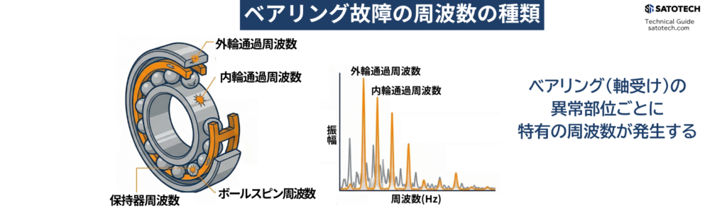 ベアリング故障周波数とは、転がり軸受内部の損傷位置ごとに現れやすい代表周波数です。