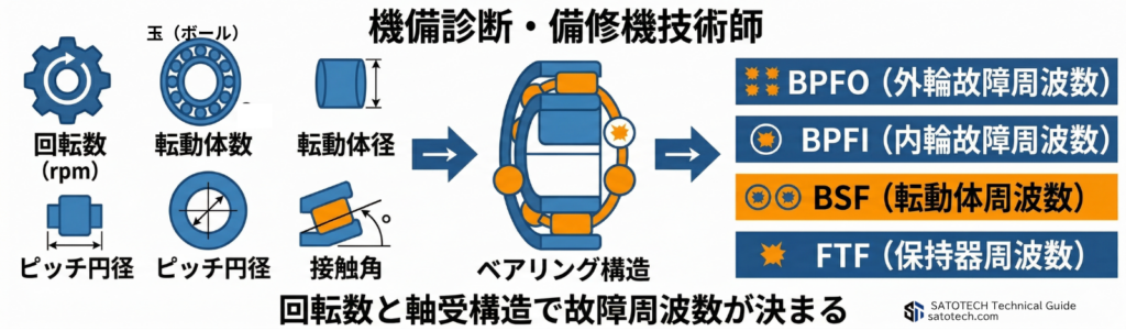故障周波数は回転数だけでなく、軸受の構造によって決まります。