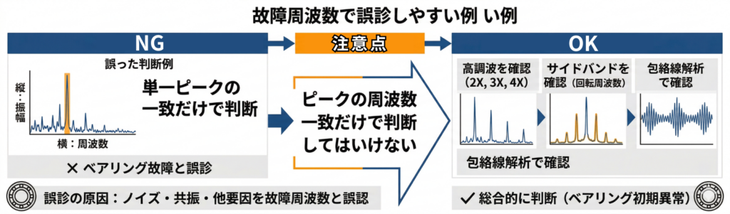 ベアリング故障周波数は有力な手掛かりですが、ピーク一致だけで判断すると誤診断のリスクがあります。