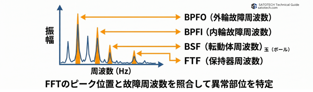 BPFOは外輪異常、BPFIは内輪異常、BSFは転動体異常、FTFは保持器異常の候補を示します。
