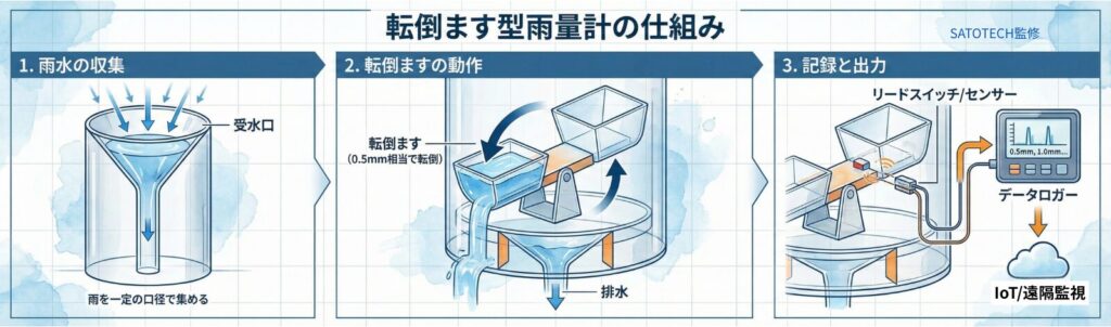 じょうご(受水口)から入った雨水が、内部にある「シーソーのような2つの枡(ます)」に溜まります。一定量(通常0.5mm)溜まると枡がコトンと倒れ、その回数をカウントして雨量を算出する仕組みです。