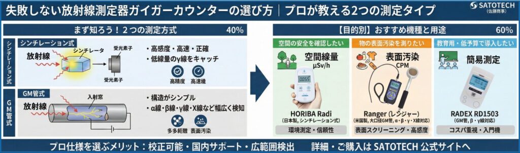 測定器選びで最も大切なのは「用途」です。空間の放射線量を測りたいのか、物の表面の汚染を調べたいのか。それぞれの目的に対して、測定器のプロであるサトテックSATOTECH(佐藤商事)が自信を持っておすすめできるモデルを厳選しました。