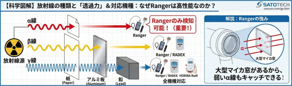 安価なモデルは「γ線のみ」しか測れないことが多いですが、プロ用機種(Rangerなど)は「α線・β線」までカバーし、汚染の見逃しを防ぎます。