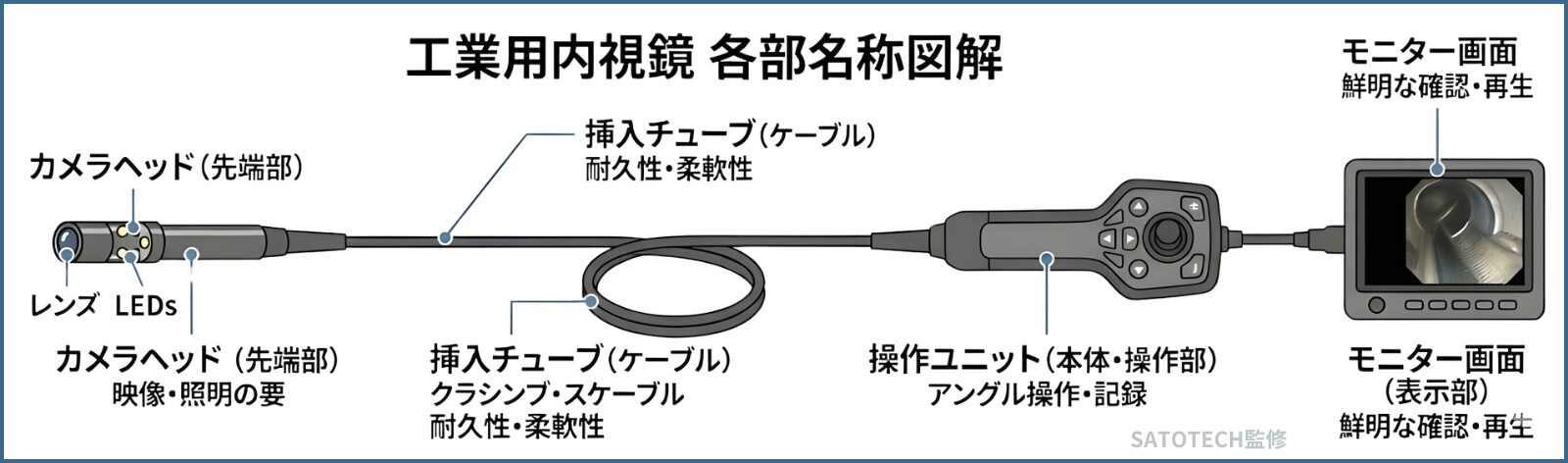 工業用内視鏡とは、人間が直接入り込めない狭い場所や曲がりくねった内部を、分解・破壊することなく観察(非破壊検査)するための光学機器です。