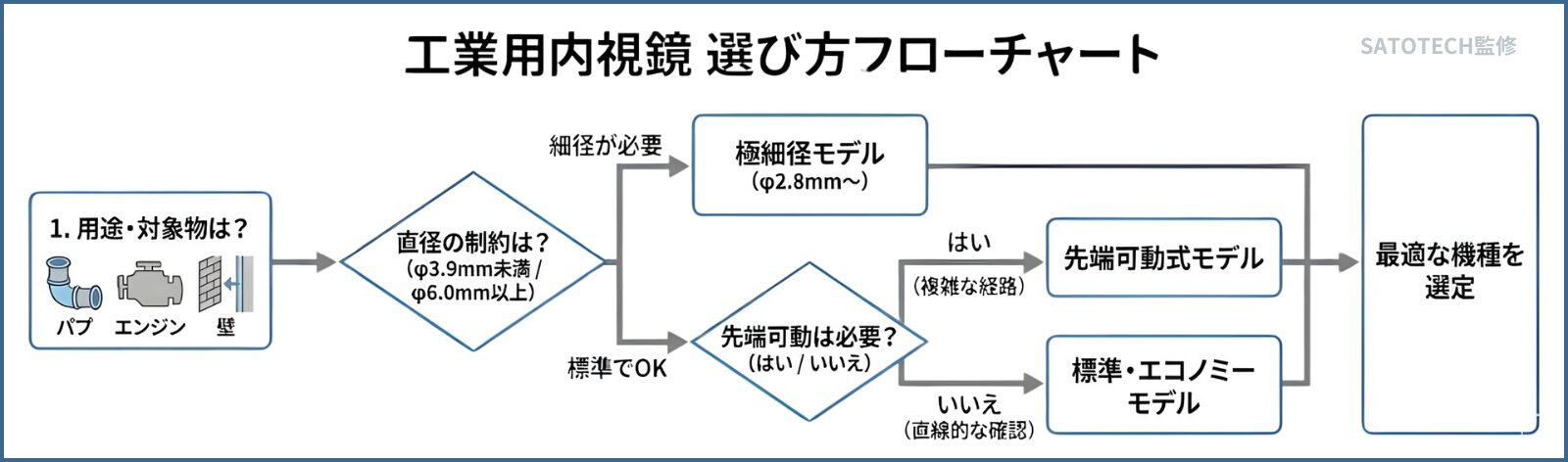 「自動車のエンジン内部を見たい」のと、「工場の排水管の詰まりを確認したい」のでは、選ぶべき内視鏡のスペックは正反対になります。