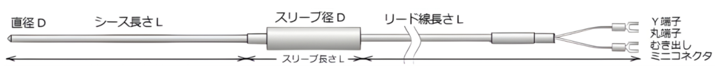 - ミリ単位の指定: シース(金属保護管)の太さはφ1.0〜φ8.0mm、長さはmm単位で指定可能です。(要相談)