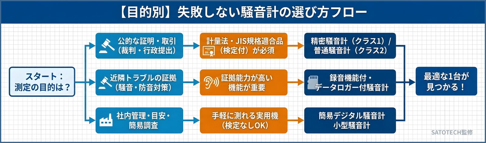 騒音計を選ぶ際、最も重要なのは「なぜ測るのか」「測った数値を何に使うのか」です。大きく分けて以下の3つのパターンから、ご自身の状況に合うものを選んでください。