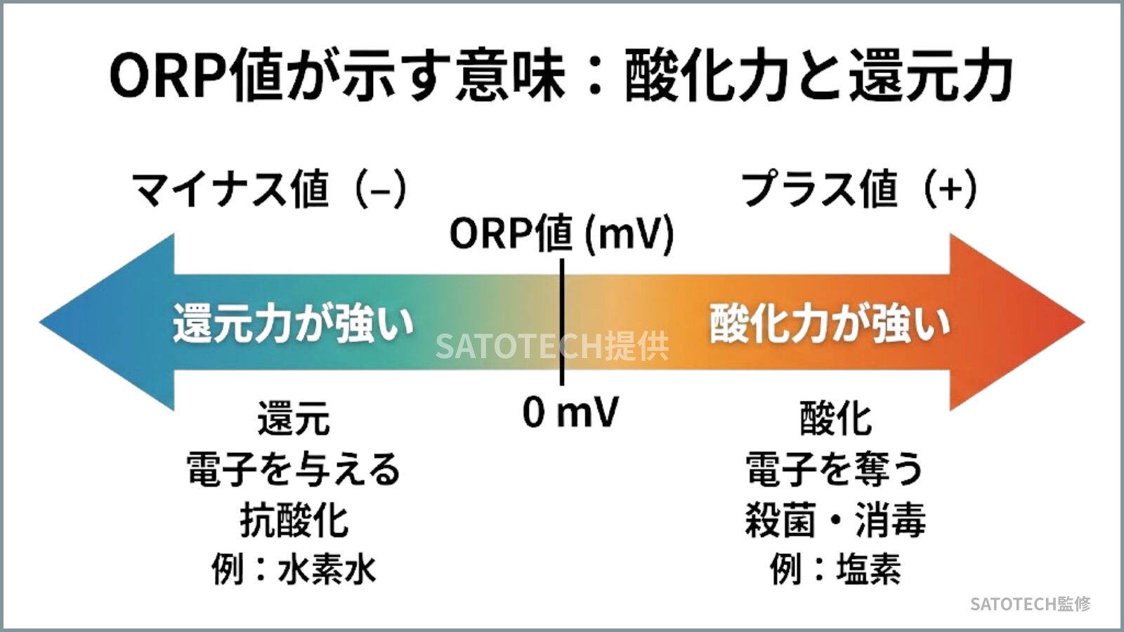 ORP値はmV(ミリボルト)で表示され、その数値のプラス・マイナスによって、対象の液体が持つ化学的な力を示します。