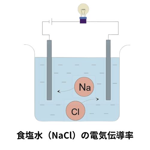 純粋な水は電気を通しませんが、不純物(塩分やミネラルなど)が溶け込むと、図のように電気が流れるようになります。