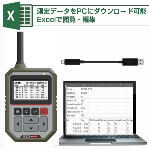 - 現在風速値、平均風速値、最大風速値、気温、大気圧を測定