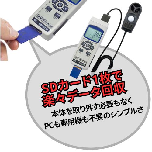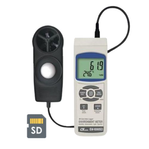 EM-9300SD は、照度・風速・温度・湿度の4種項目を1台で測定・記録できる多機能環境計測器。市販SDカードへデータを保存可能で、別売騒音プローブ装着により騒音測定も拡張可能です。Excel形式(CSV)対応のデータロガー機能とシンプルな操作性で、教育・研究・現場点検用途にも適した信頼仕様機です。