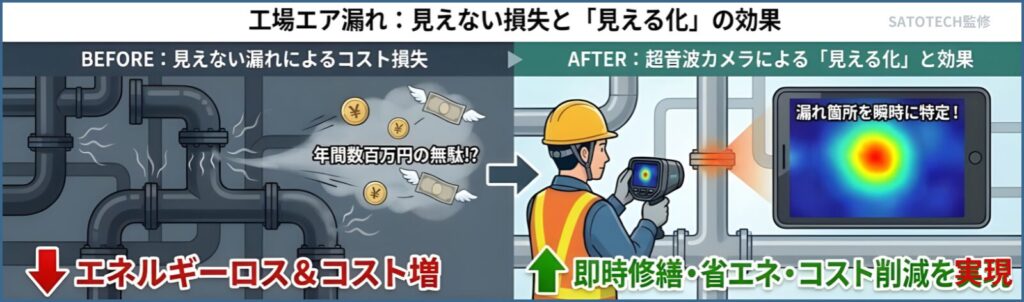 工場の省エネ対策において、最も見落とされがちな「圧縮空気の漏れ(エアリーク)」。目に見えない空気漏れは、知らず知らずのうちに莫大な電気代の損失を生み出しています。