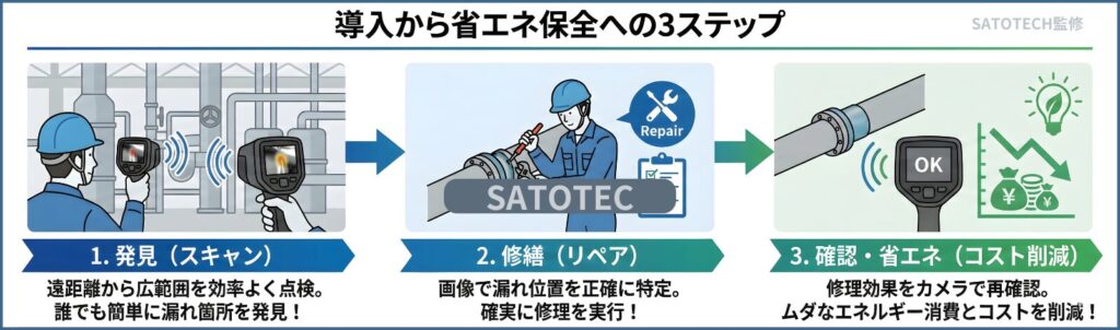 • 画面上に「0.5L/min」「推定年間損失:15,000円」のように具体的な数値を表示。