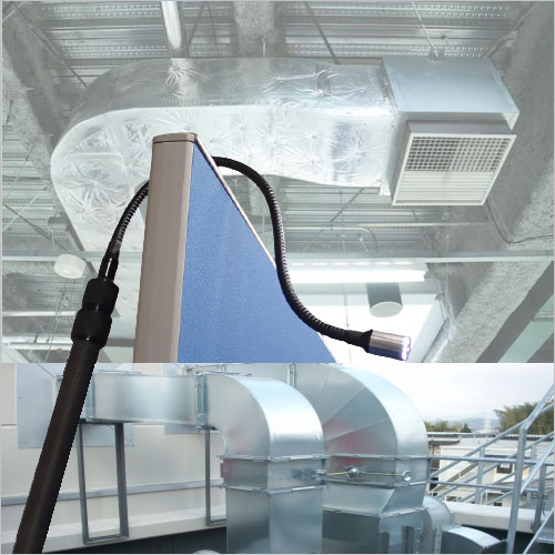 最大5.6mまで伸びる伸縮ポールにより、従来は高所作業車や足場が必要だった場所の点検を、地上から安全に行うことができます。