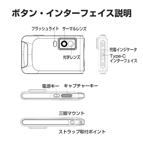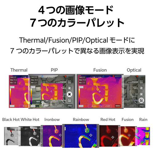 熱画像、可視画像、融合画像(画輪郭強調)を切り替え。