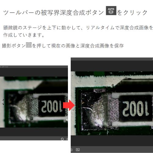 SDカードに保存した過去の画像と、現在映しているリアルタイム映像を左右に並べて表示できます。良品との比較検査や、経時変化の観察に最適です。