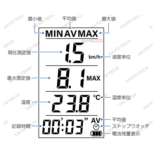 - 測定単位: km/h・ m/s・ cm/s